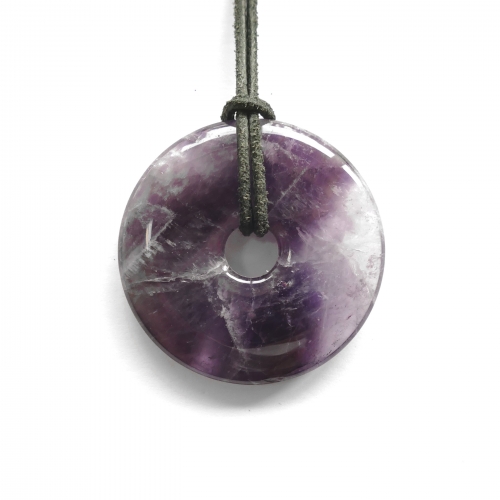 Bei diesem Artikel handelt es sich um einen Donut aus Amethyst mit 40 mm Durchmesser. Im Lieferumfang weiters enthalten ist ein 50 cm langes schwarzes Ziegenlederband mit Verschluss in der Stärke 15 mm. Da es sich bei den verarbeiteten Steinen um ein Naturprodukt handelt können Farben, Form und Musterung vom Beispielbild abweichen. Verbraucherhinweis: Bitte bedenken Sie, dass alle beschriebenen Wirkungen wissenschaftlich nicht belegbar sind und daher keinen Besuch beim Arzt ersetzen.